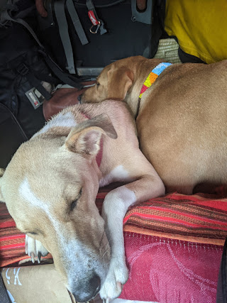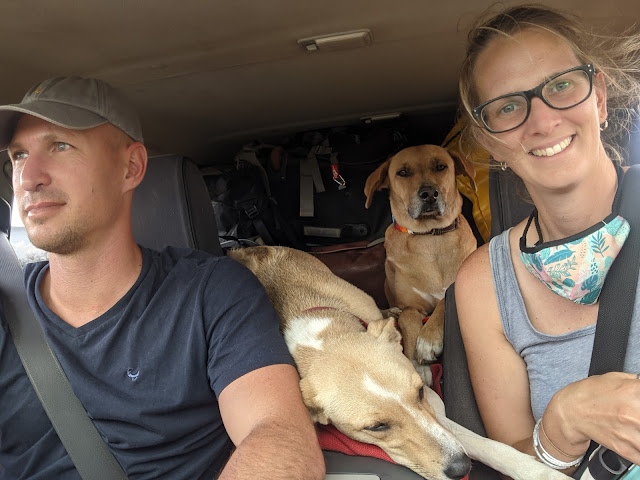 Finally, we are off again…5 mins into the continued journey poor Rafa, a very un-snuggly dog has been forced to snuggle up to Roo as a bag fell on his side due to poor, pissed-off packing! Lucky Roo is needy and loves him so she is acting as his chin rest.